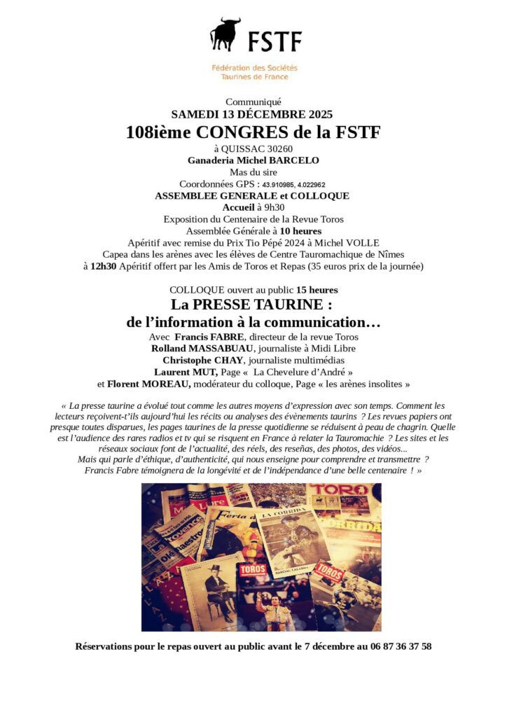 Samedi prochain, se tiendra le congrès de la FSTF avec un thème passionnant, celui de la presse taurine. Comme on le verra ci-dessous, les questions posées par ce thème sont importantes et méritent une attention profonde. D’autant que même les médias électroniques cessent leur activité : corridasi.com a annoncé sa fermeture et Toros2000 ne sera bientôt plus mis à jour…