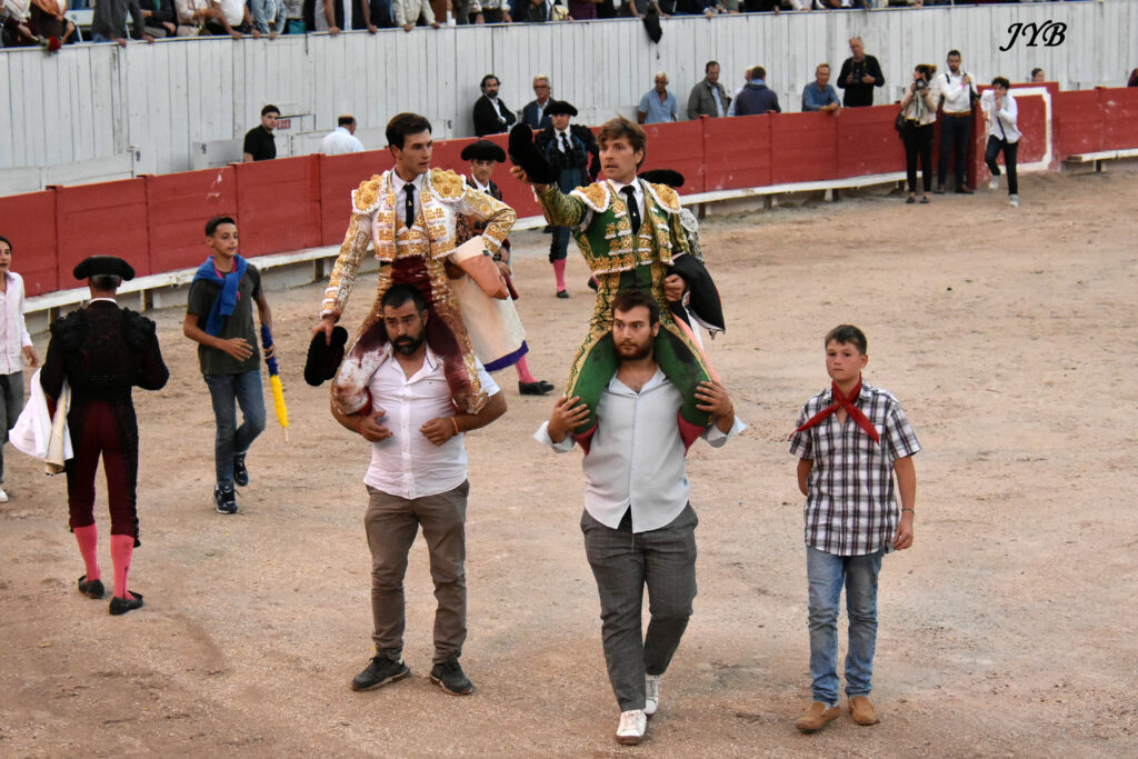 Sortie a hombros de Juan Leal et Samuel Navalon, à l’issue de la corrida de Margé, à Arles, le 14 septembre 2025. ©JYB
