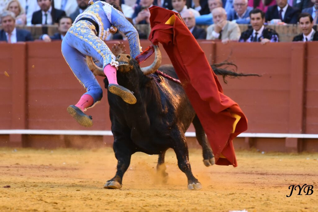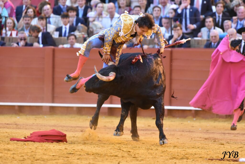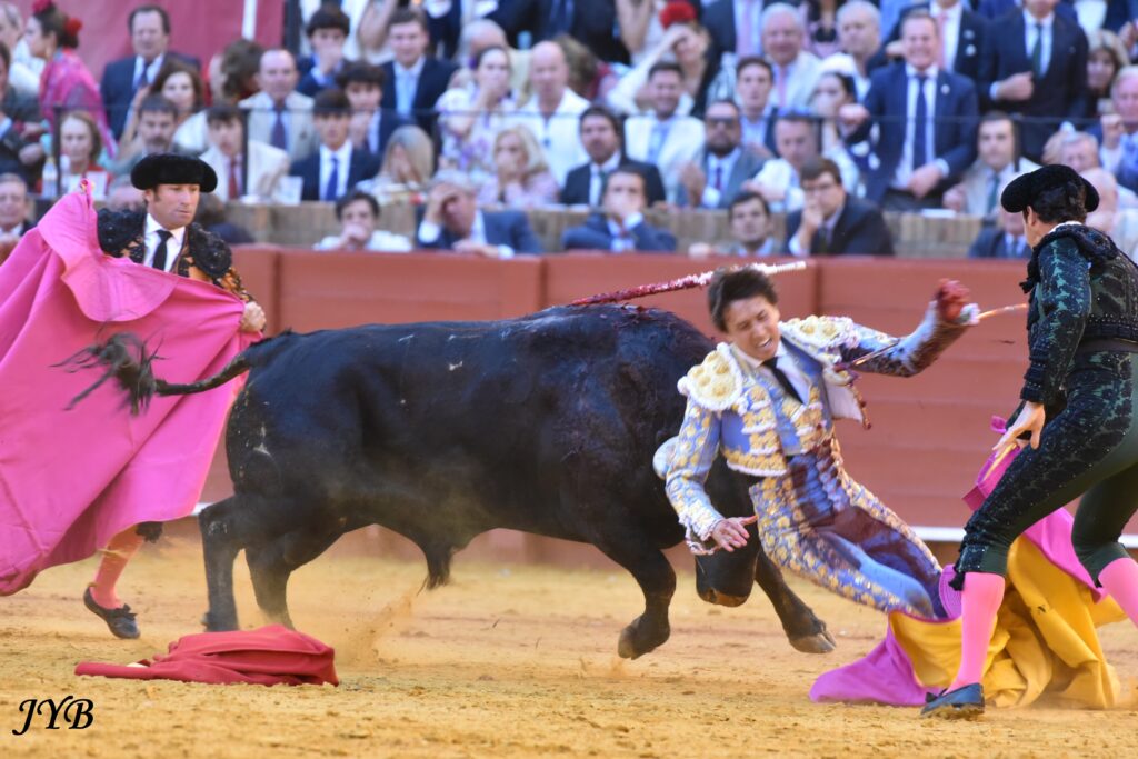 Première cornada de Roca Rey, devant Soleares, n°173 de Toros de Cortes, à Séville, le 23 avril 2026. ©JYB