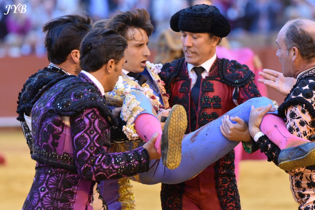 A la porte de l’infirmerie, Roca Rey porté par sa cuadrilla, à Séville, le 23 avril 2026. ©JYB