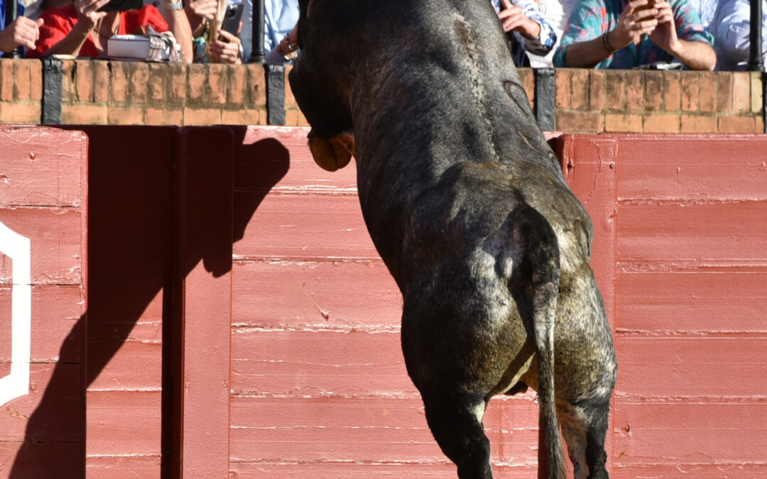 La morphologie du taureau en action dans toute sa splendeur sous un angle inhabituel, frontal de dos ( le « de frente por detrás » me tente. Grandiose! Majestueux le taureau dans sa puissance mise en œuvre pour fuir cette fois!