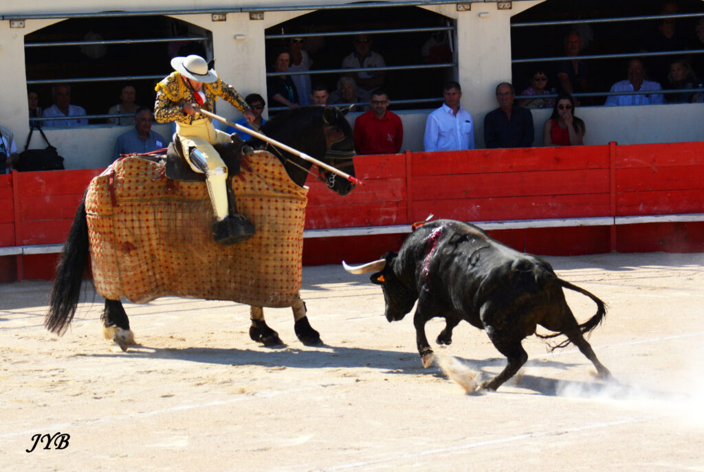 Gabin Rehabi de la cuadrilla de Michelito, devant le toro n°56 de Blohorn, à Alès, le 27 mai 2017. La pique Bonijol avec ses deux couleurs rouge et blanc n’était pas encore en service. ©JYB archives