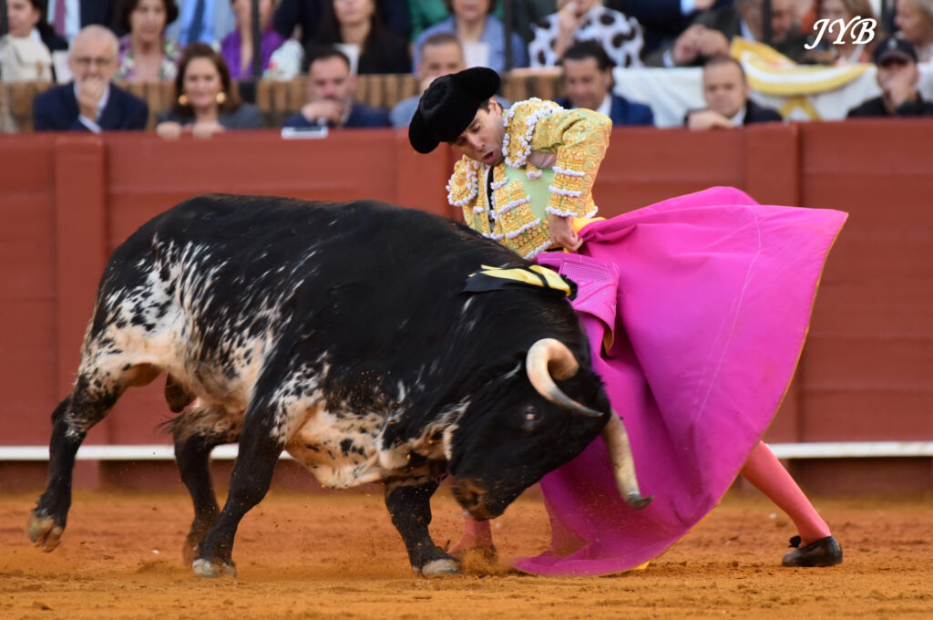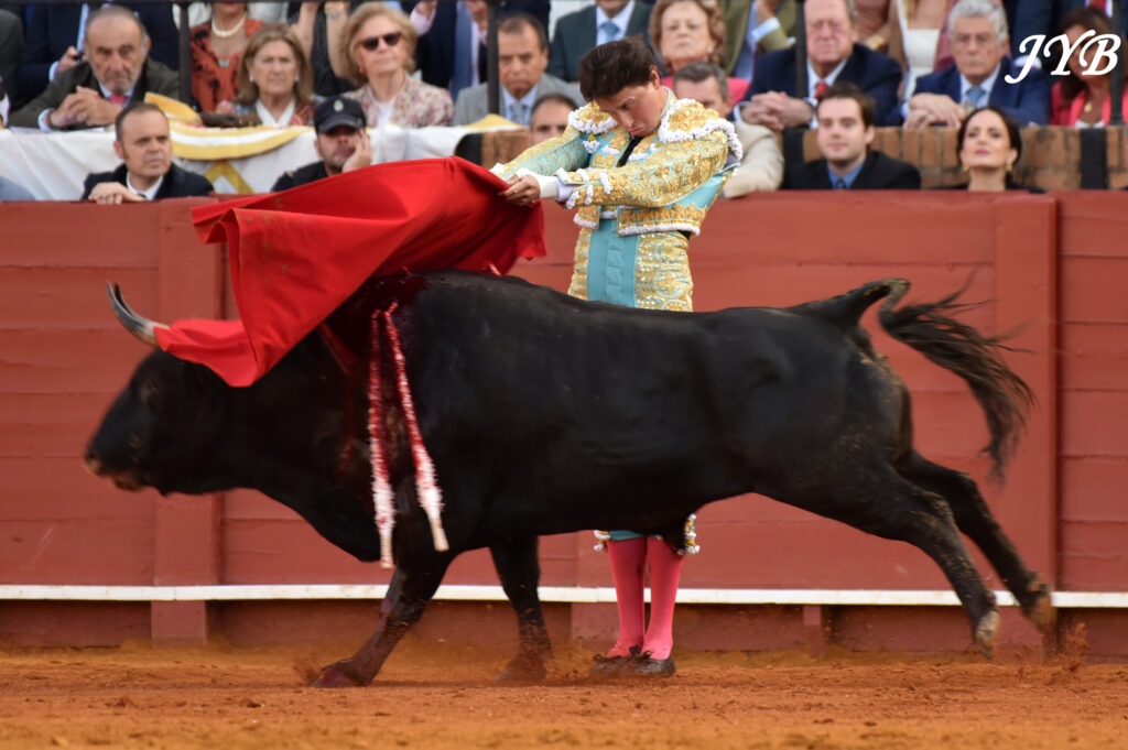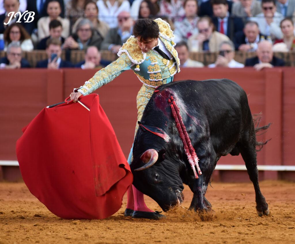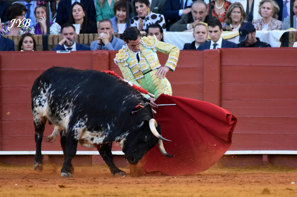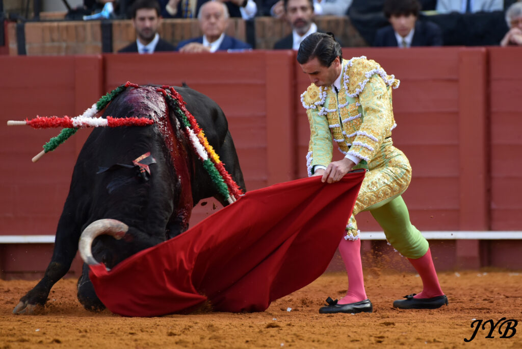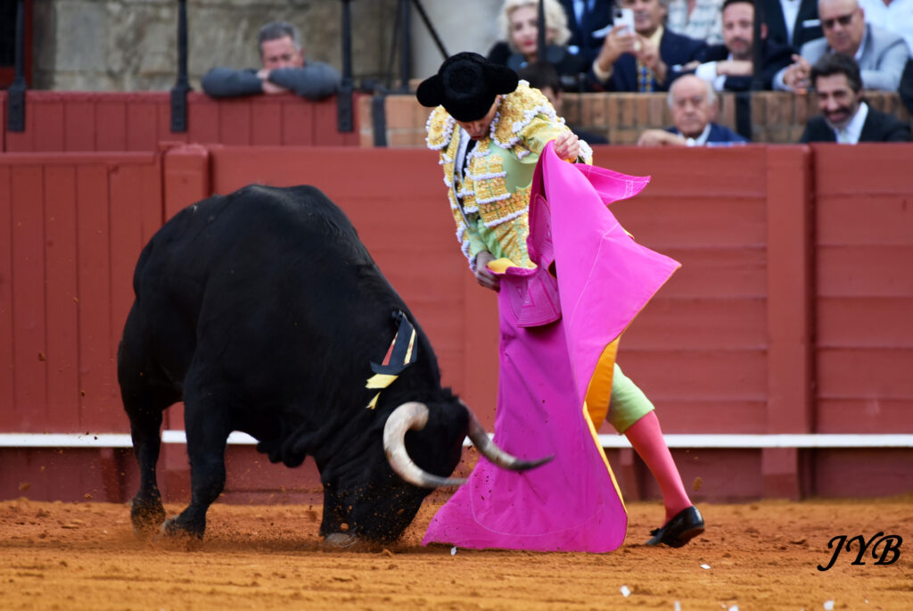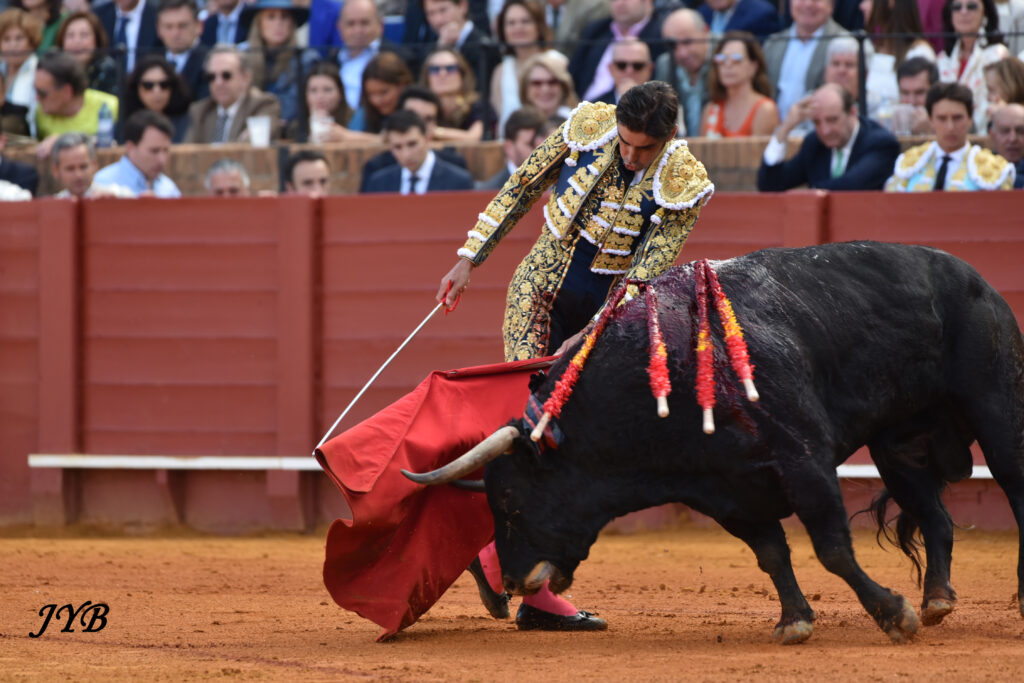 Le 6 ème est amené jusqu’au centre par des véroniques dont certaines à pieds joints. A la pique, le toro est épargné, pour un début de faena par statuaires et des séries de derechazos dont la clé est le ligazon : la musique joue ! Les passes sont aussi bien liées à droite qu’à gauche et la Maestranza s’enflamme. Des passes par le haut pour terminer, et c’est l’échec à l’épée : 2 pinchazos et une entière contraire le long des planches. L’ovation a été belle à la sortie, et Roca Rey peut encore rêver à son deuxième cartel samedi (El Parralejo).
