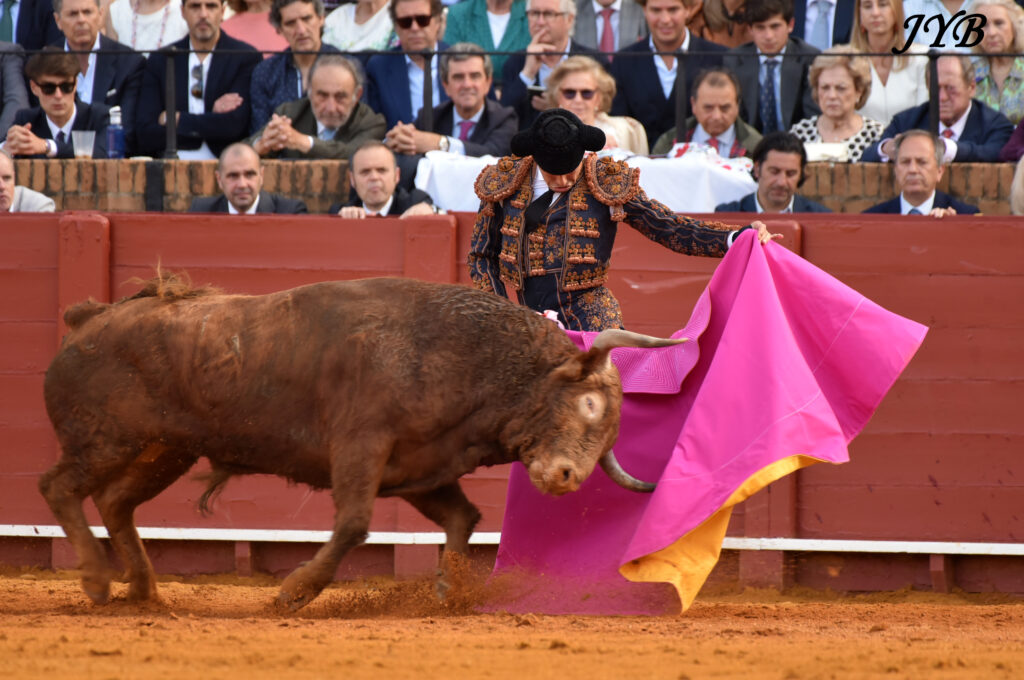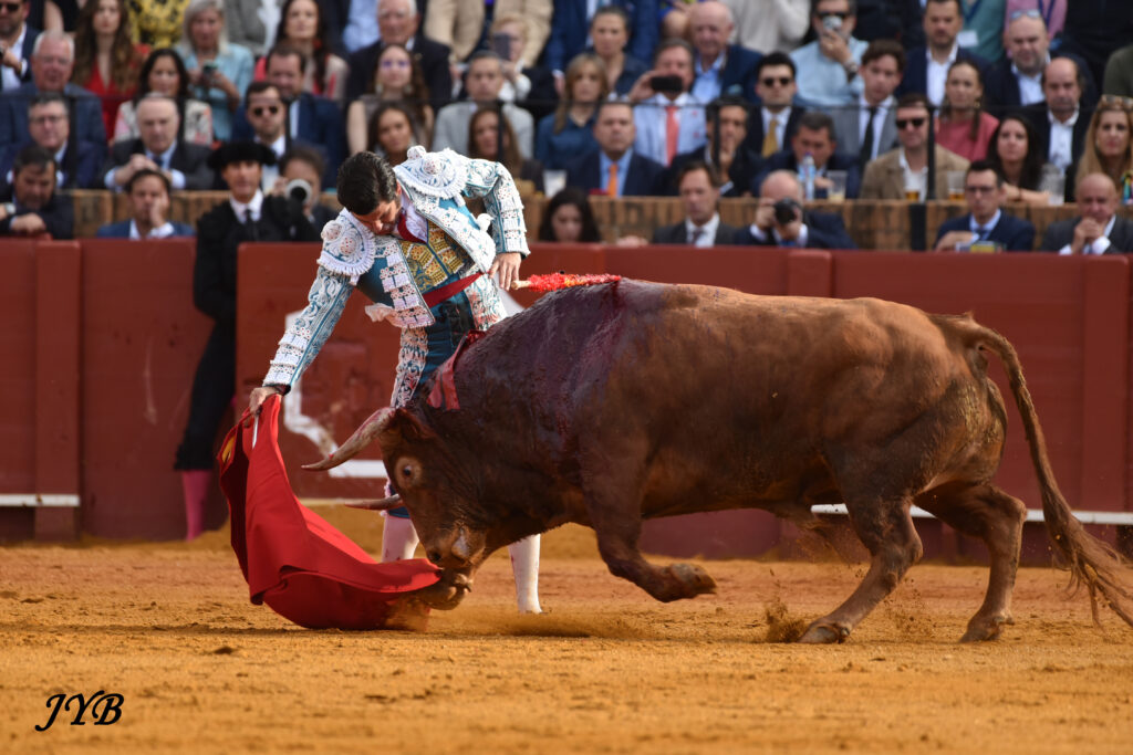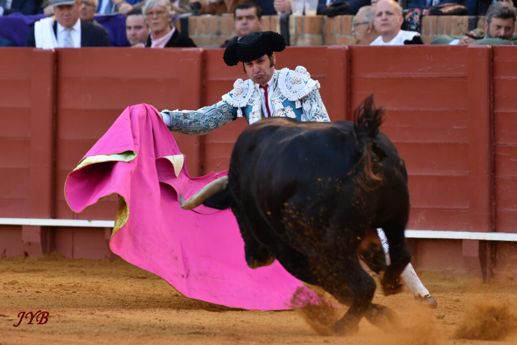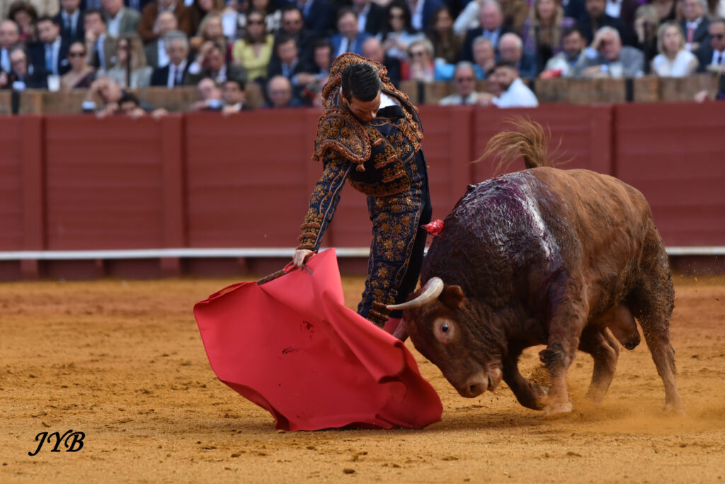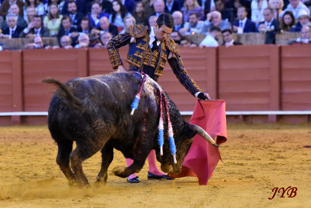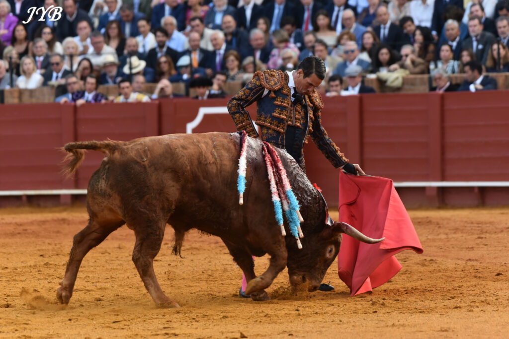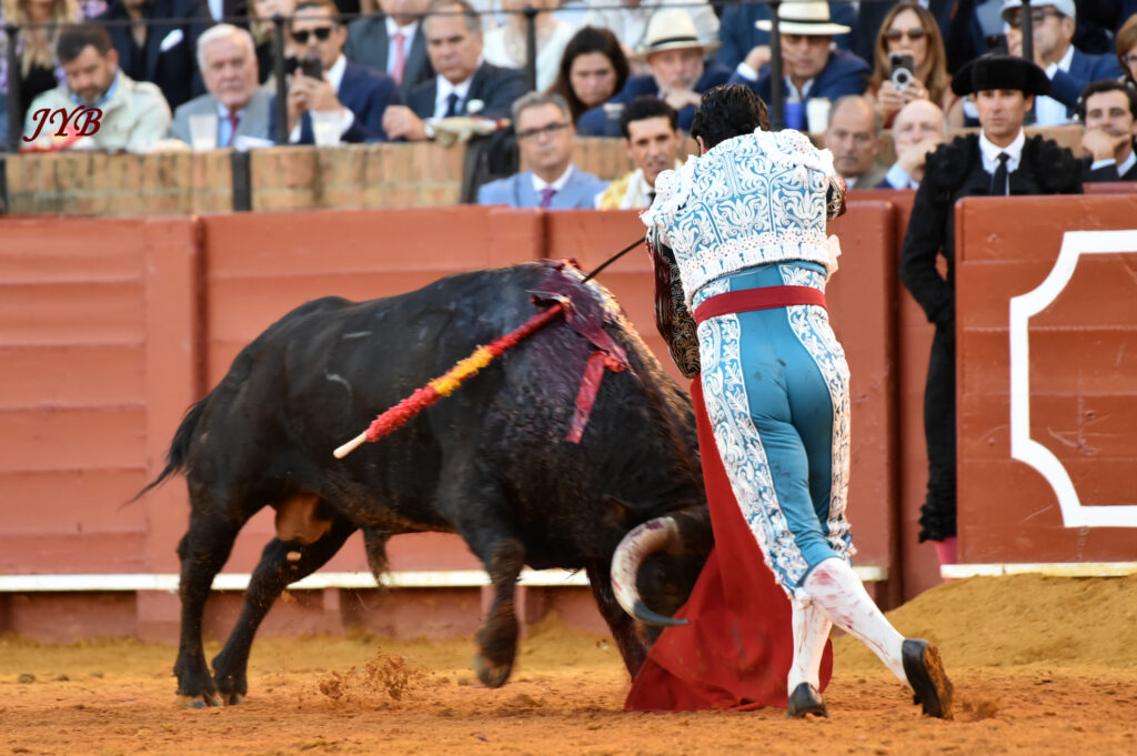 Ce ligazon se retrouve dans les naturelles ce qui enthousiasme la Maestranza, de même que les abanicos qui terminent la séquence. L’estocade en entrant droit est tombée, mais n’empêche pas l’attribution de l’oreille après pétition majoritaire.