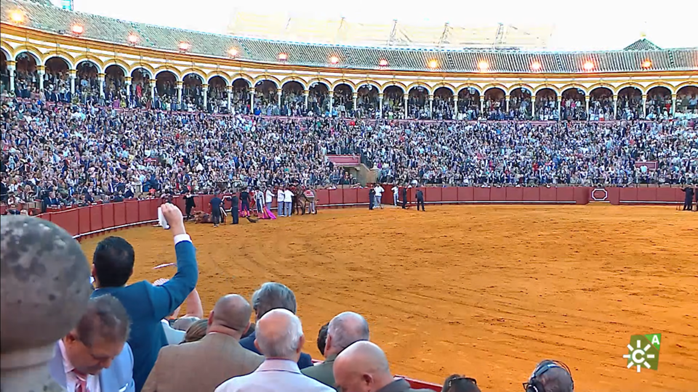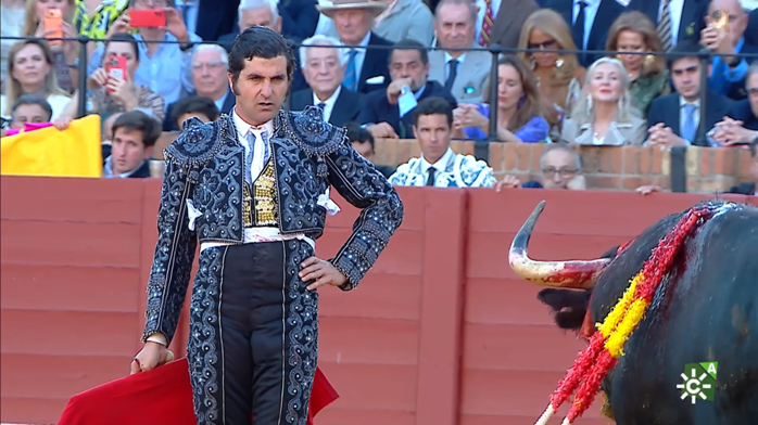 Entame de faena de Morante à son deuxième toro. Le Maestro arbore un costume original noir ou bleu nuit aux parements bleus chargés de paillettes qui sont censées capter la lumière de Pâques. Photo capture d’écran Canal Sur.