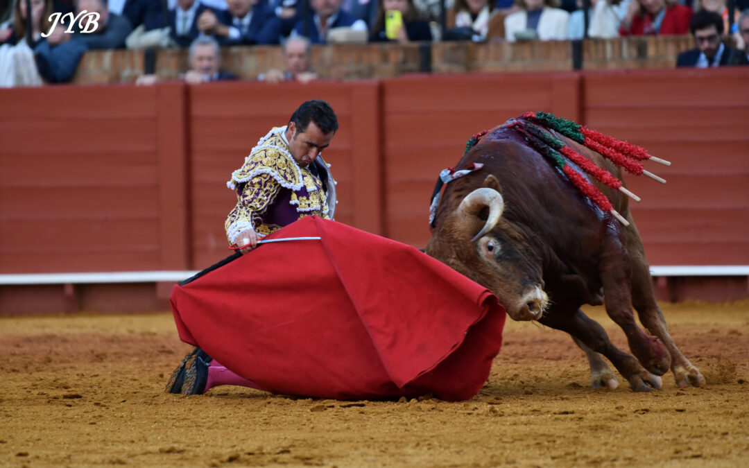 El Fandi, à genoux dans des derechazos circulaires de 360 degrés, devant Profesor, n°101 d’Alcurrucen, à Séville, le 30 avril 2025. ©JYB Les toros d’Alcurrucen avaient le poids qu’il fallait, mais sans doute pas la caste et rien d’autre qu’une noblesse un peu...