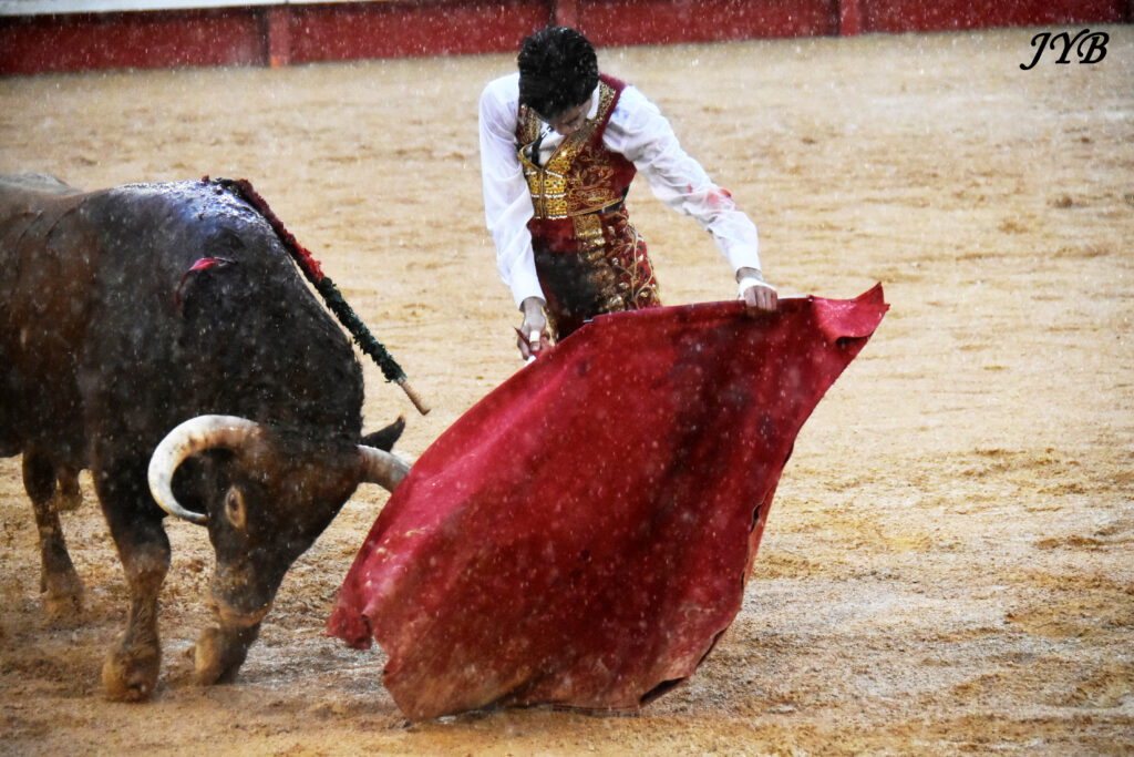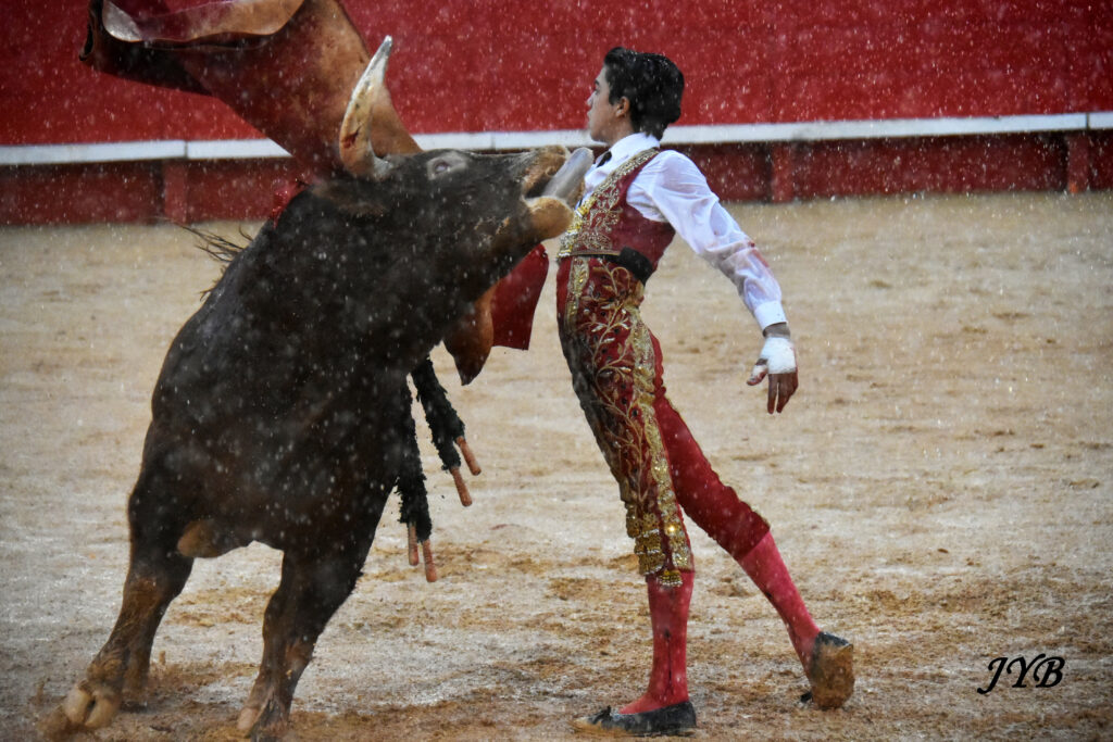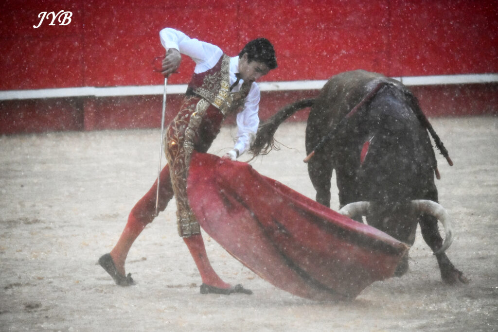 Blessé à la main à ce toro (gros arrachement de la peau du pouce nécessitant une douzaine de points de suture), il n’en a pas moins terminé sous une pluie battante, qui empêche la lidia de la corrida de la Quinta le soir, avec efficacité entrega et courage.